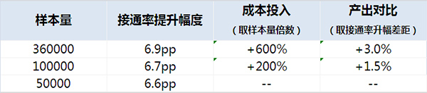 進入大數(shù)據(jù)時代,對于樣本規(guī)模的考量往往只有一個答案——無需抽樣,直接使用全量數(shù)據(jù)。站在實際運營的角度,樣本規(guī)模越大,意味著數(shù)據(jù)處理、模型搭建等各環(huán)節(jié)需要投入的時間和精力越多,模型對于業(yè)務變更的響應速度越慢。是否真的有必要使用全量數(shù)據(jù)?縮減樣本規(guī)模是否也同樣可以實現(xiàn)精準識別?我們嘗試使用5萬、10萬和36萬3個不同規(guī)模的樣本搭建判別式模型,從圖3可見接通率提升幅度與樣本量呈正相關關系,對“大數(shù)據(jù)”的強調(diào)存在統(tǒng)計意義上的合理性;但從成本和產(chǎn)出的增速來看,600%的額外投入僅能帶來3%的提升。其中的得與失目前并無統(tǒng)一的評判標準,建議呼叫中心決策者依據(jù)企業(yè)實際情況,具體問題具體分析(如圖3)。