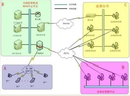 方案一:400電話+托管呼叫中心平臺(tái)+坐席分布在總部和分布點(diǎn)