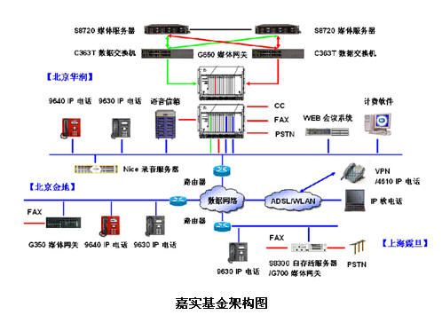 ?。?)IP語音通信:在本次方案中,嘉實基金北京華潤總部選用了AVAYA最新的Communications Manager 軟件和基于安全可靠的S8720媒體服務(wù)器硬件平臺;上海嘉實基金則選用G700媒體網(wǎng)關(guān)選用了S8300媒體服務(wù)器,實現(xiàn)通過IP網(wǎng)絡(luò)和北京總部鏈接,并可在網(wǎng)絡(luò)中斷的情況下,實現(xiàn)LSP自存活的功能,保持語音通信服務(wù)不間斷;嘉實基金北京總部交換機(jī)和上海分部交換機(jī)通過IP中繼通道,實現(xiàn)北京和上海兩地的辦公電話互連互通,并為公司節(jié)省大量長途通信費用。