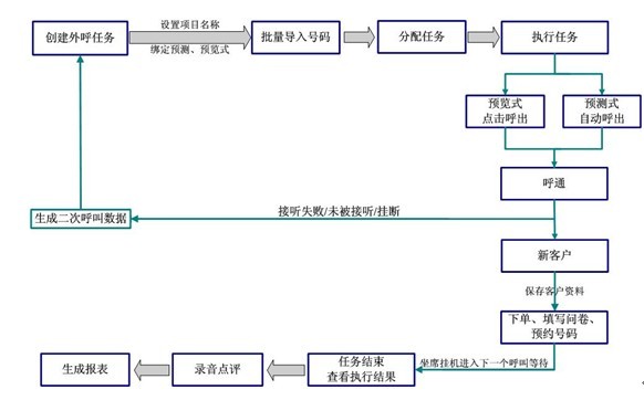 針對貴金屬行業(yè)營銷現(xiàn)狀,結(jié)合貴金屬經(jīng)營企業(yè)的業(yè)務(wù)流程,集時(shí)通訊開發(fā)出一套呼叫中心營銷平臺,其外呼營銷流程如下圖: