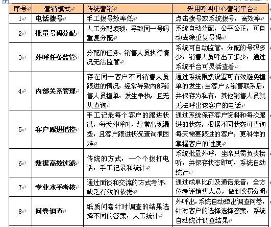 傳統(tǒng)電話營銷模式與呼叫中心營銷平臺外呼模式對比: