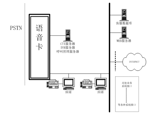 自建式呼叫中心是企業(yè)自己購買軟件和硬件,靈活定制系統(tǒng)業(yè)務(wù),訊銘軟件十年以來一直專注于自建式呼叫中心,在系統(tǒng)方案實現(xiàn)上,按照接入技術(shù)劃分有基于板卡式的呼叫中心和基于交換機式的呼叫中心,兩者在硬件上差別不大,只是后者比前者多了一個專門處理ACD話路分配的交換機,企業(yè)在方案選擇上,應(yīng)該從預(yù)算、線路、坐席數(shù)量上綜合考慮,現(xiàn)把訊銘軟件兩種方案的特點詳列出來,如下圖所示為基于板卡式的呼叫中心架構(gòu):