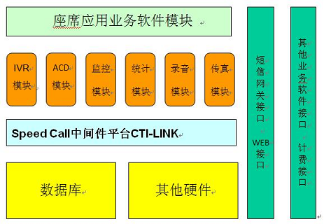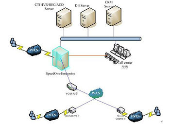 在完善的數(shù)據(jù)網(wǎng)絡(luò)(LAN&WAN)基礎(chǔ)上,將基于Speed Call系統(tǒng)的中間件產(chǎn)品CTI-LINK部署在系統(tǒng)上,它包括:純軟件實(shí)現(xiàn)的 IVR系統(tǒng)、具有多種智能策略分配功能的ACD系統(tǒng)、高性能的純軟件實(shí)現(xiàn)的坐席錄音系統(tǒng)、功能完善的話務(wù)坐席管理統(tǒng)計(jì)系統(tǒng)、支持多種結(jié)構(gòu)方式的坐席接口OCX控件等,完成了SpeedOne呼叫中心系統(tǒng)接入、分配及系統(tǒng)管理工作。