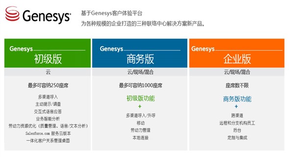 該商務版是目前為中到大型聯(lián)絡中心設計的功能最齊全、靈活性最高的客戶體驗解決方案。借助此版本,客戶可選擇通過云、現(xiàn)場或混合云配置的方式運營聯(lián)絡中心,其中現(xiàn)場運營模式需預先配置設備?,F(xiàn)場運營設備是 Genesys推出的全新運營設備,其需要多種 配置。不論是采用云還是采用現(xiàn)場的方式, Genesys的商務版都可以進行快速部署,且使用簡易,并且可按聯(lián)絡中心的增長需求而升級。其功能包括: