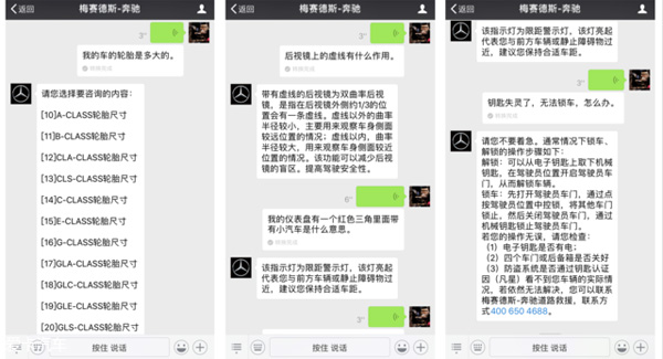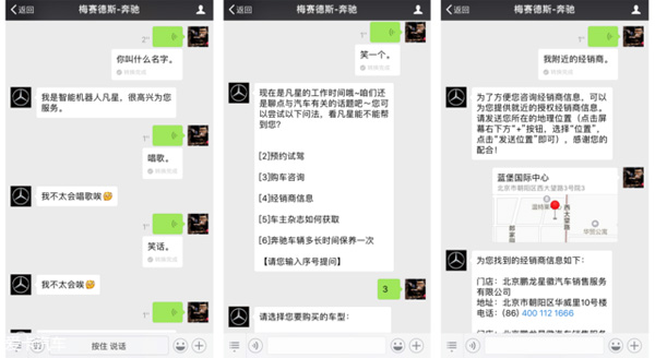 以往,車主想要很清楚地咨詢買車和售后信息,要么是多次打熱線電話,要么要親自去4S店,直到搞清楚位為止。但是現(xiàn)在,如果你想購(gòu)買或者保養(yǎng)奔馳、smart,你只需要關(guān)注品牌的官方公眾號(hào)就行,通過(guò)奔馳官方微信服務(wù)機(jī)器人“凡星”或奔馳客戶服務(wù)官方微信客服機(jī)器人“小me星”的“智能交互”方式來(lái)獲得手掌服務(wù),動(dòng)動(dòng)嘴、動(dòng)動(dòng)手就行,不用大費(fèi)周章的一次一次的往返4S店,讓買車和售后服務(wù)都變的非常簡(jiǎn)單。而smart的車主則可以關(guān)注公眾號(hào),通過(guò)smart的客服機(jī)器人“小s君”獲得在線智能服務(wù)。