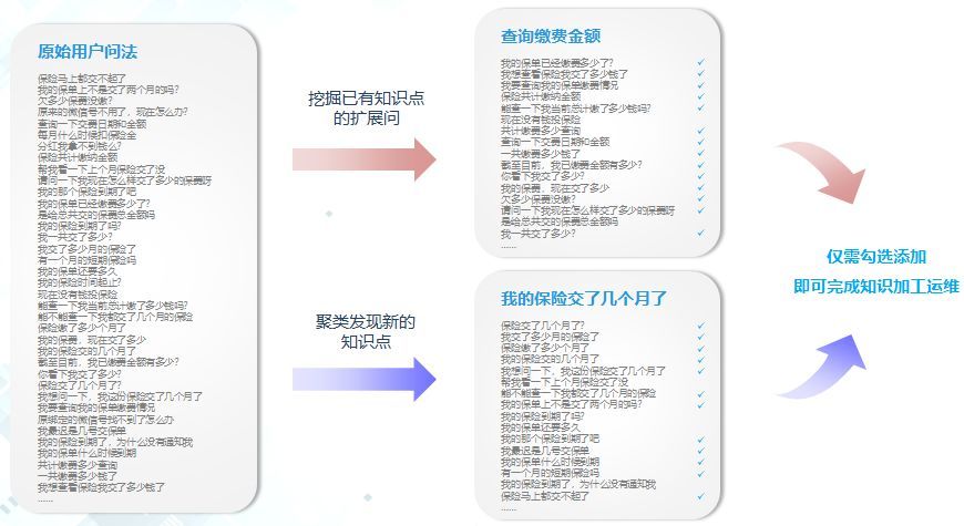 系統(tǒng)還能夠從歷史對話數(shù)據(jù)中,進行無監(jiān)督聚類(無需人工參與),自動挖掘出新的知識點,輔助知識加工人員進行知識點歸納。