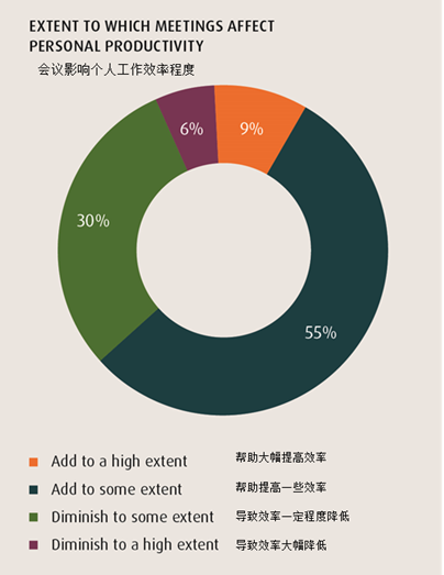 報(bào)告強(qiáng)調(diào),由于工作環(huán)境注意力分散將影響工作與生活的平衡,而由此造成的工作效率的低下則導(dǎo)致企業(yè)無法吸引或保留更有價(jià)值的員工。今天,相當(dāng)比例的知識(shí)型從業(yè)者很難在正常的工作時(shí)間內(nèi)完成他們的任務(wù)。為了不因拖延影響第二天工作,36%的員工不得不用額外的時(shí)間加班完成任務(wù)。為了提高會(huì)議效率,電子白板、揚(yáng)聲器、項(xiàng)目管理軟件、思維導(dǎo)圖或頭腦風(fēng)暴軟件等技術(shù)經(jīng)常被使用。然而,與人們的想象恰恰相反:應(yīng)用這些工具往往會(huì)影響工作效率,比如花費(fèi)時(shí)間設(shè)置電話會(huì)議。因類似情況而浪費(fèi)的時(shí)間和投資非常驚人:25%的會(huì)議因?yàn)榧夹g(shù)或使用問題而拖延。這意味著每次會(huì)議平均損失2.7分鐘。根據(jù)參會(huì)人數(shù)的不同,對(duì)企業(yè)造成的損失還會(huì)有不同程度增加。與此同時(shí),71%的會(huì)議在一個(gè)場(chǎng)地舉行,29%的會(huì)議場(chǎng)所分布于多個(gè)地點(diǎn),因此,合作技術(shù)至關(guān)重要。然而,知識(shí)型從業(yè)者因此類技術(shù)的使用困難而產(chǎn)生巨大挫折感,多達(dá)50%的員工稱這是最讓人煩惱的地方。