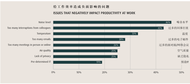《辦公室工作效率》報(bào)告顯示,多數(shù)員工對(duì)企業(yè)為提高效率而提供的開放式工作環(huán)境表示質(zhì)疑:多數(shù)人(34%)在開放式辦公室工作,這種辦公環(huán)境同時(shí)也被認(rèn)為是工作效率最低的(35%表示贊同)。