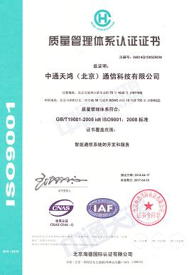 近日,北京海德國際認證有限公司來中通天鴻進行質(zhì)量管理體系認證,在公司全體部門積極配合下,中通已于4月17日正式通過國家質(zhì)檢中心的認證。標志著我們智能通信系統(tǒng)的開發(fā)和服務完全符合GB/T19001-2008 idt ISO 9001:2008的標準。