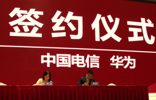 中國電信云公司副總經(jīng)理黃禮蓮、華為中國電信系統(tǒng)部部長曹既斌簽署戰(zhàn)略合作協(xié)議