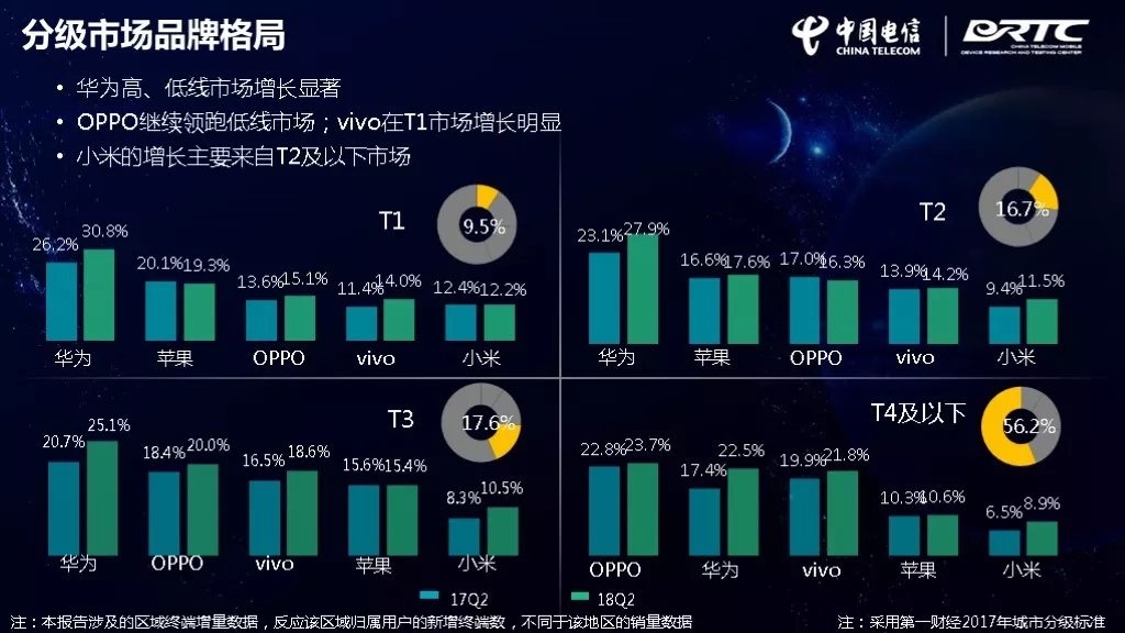 分級市場(按照第一財經(jīng)2017年城市分級標準)品牌格局位華為高、低線市場增長顯著;OPPO繼續(xù)領(lǐng)跑低線市場;vivo在T1市場增長明顯;小米的增長主要來自T2及以下市場。
