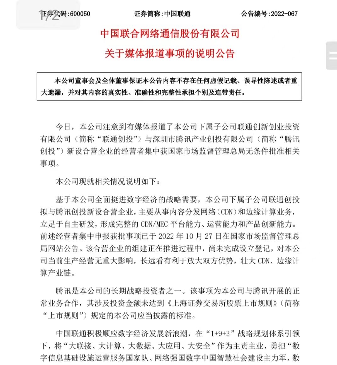 2日晚間,中國(guó)聯(lián)通官方便出面為事情降溫。中國(guó)聯(lián)通發(fā)布公告回應(yīng)稱,該合營(yíng)企業(yè)的組建正在推進(jìn)過程中,尚未完成設(shè)立登記,對(duì)本公司當(dāng)前生產(chǎn)經(jīng)營(yíng)無重大影響,從長(zhǎng)遠(yuǎn)來看有利于放大雙方優(yōu)勢(shì),壯大內(nèi)容分發(fā)網(wǎng)絡(luò)(CDN)、邊緣計(jì)算產(chǎn)業(yè)鏈。