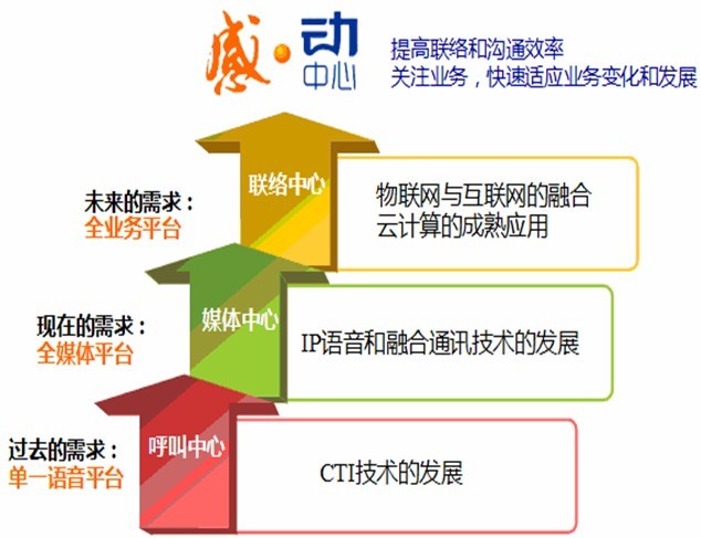 這是“感•動中心”的主旨,完全以客戶的業(yè)務(wù)為出發(fā)點,體現(xiàn)“以客戶為中心”的理念。而“全景中心”、“聯(lián)絡(luò)中心”等以純技術(shù)為中心,還停留在多媒體通訊和UC通訊手段融合層面,只是新增加了一些新方式的接入等技術(shù),對于客戶業(yè)務(wù)的融合和適應(yīng),并沒有任何提升。