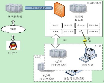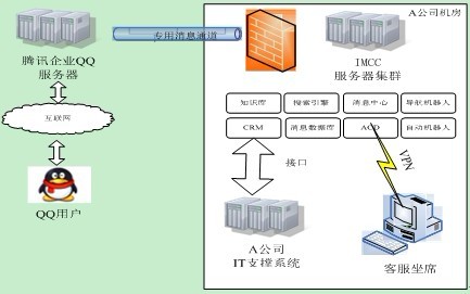 IMCC提供了與企業(yè)的CRM系統(tǒng)、知識(shí)庫系統(tǒng)、業(yè)務(wù)系統(tǒng)全面對(duì)接的能力,可以實(shí)現(xiàn)一個(gè)企業(yè)一個(gè)QQ號(hào)碼,用戶QQ接入時(shí)聯(lián)動(dòng)顯示其資料及歷史服務(wù)記錄、可分用戶級(jí)別提供差異化服務(wù)等專業(yè)呼叫中心的功能。通過與企業(yè)的IT系統(tǒng)對(duì)接,能大幅提高對(duì)客戶服務(wù)的效能,并利用企業(yè)QQ的好友用戶群提供全新的營銷渠道。