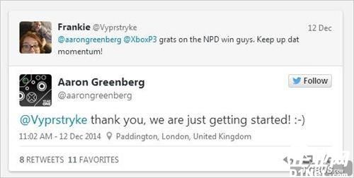 因?yàn)閄BOX ONE十一月份在英國(guó)以及美國(guó)地區(qū)的優(yōu)秀成績(jī),來(lái)自微軟的Aaron Greenberg在推特上說(shuō)道:“我們這才剛剛開(kāi)始呢!。”Greenberg的官方頭銜是XBOX第一及第三方游戲市場(chǎng)營(yíng)銷部主管,直到今年6月Greenberg才坐上這個(gè)位置。