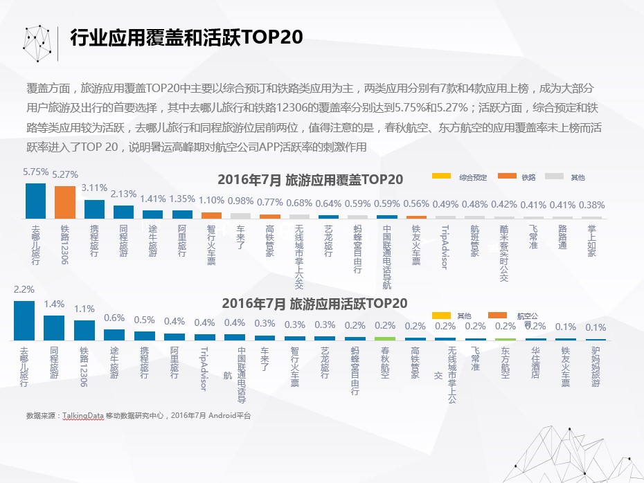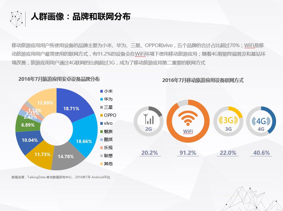 2016年7月份,雖然去哪兒還在第一位,但是2015年十一的時候,去哪兒的用戶數(shù)量覆蓋率在12%,今年5%多,很多新興企業(yè)已經(jīng)走到這個數(shù)據(jù)的前面,包括同程、阿里,這些在全年都是沒有看到的,7月份旅游活躍前20位里面,我們看到春秋航空和東方航空,這在去年也是沒有的。同樣的在整個安卓市場里面,我們更多看到了年輕人喜歡用的機(jī)型,魅族、VIVO、OPPO,自帶強(qiáng)相關(guān)性、社交性以及分享機(jī)制的手機(jī)已經(jīng)逐漸的快要超越華為、三星和小米,越來越多移動應(yīng)用的場景已經(jīng)轉(zhuǎn)到WIFI、4G,我們相信未來越來越多行程規(guī)劃類的大圖片、視頻甚至直播這樣的業(yè)態(tài)會進(jìn)入旅游行業(yè)。