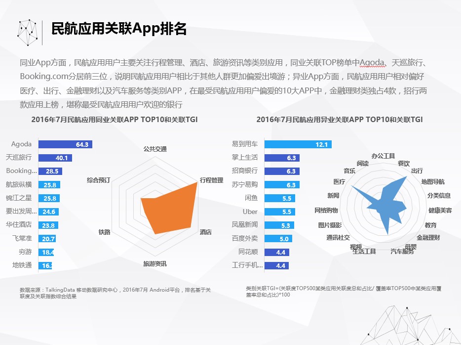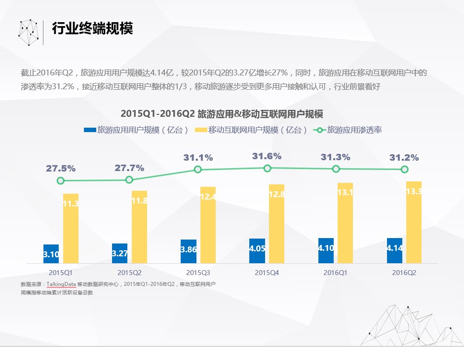 經(jīng)過一年的耕耘,前段時間有人問我作為一家互聯(lián)網(wǎng)公司和航空行業(yè)合作有什么感受?我當(dāng)時很深情的望著他說,你創(chuàng)業(yè)過嗎?創(chuàng)業(yè)的感覺就是你每天在自殺和微笑活下去之間徘徊,如果我今天對于航空公司的抱怨有一些大家覺得不太好接受的地方,請當(dāng)成是我童言無忌。在正式開始之前,我先給大家分享一組數(shù)據(jù)。這是我們在2016年三季度用暑期報告發(fā)布的一個數(shù)據(jù)報告,從這個數(shù)據(jù)報告可以看到,我們右邊的黃色的條是整個中國的移動互聯(lián)網(wǎng)設(shè)備數(shù),移動設(shè)備數(shù)量,我們左邊這個藍(lán)色的柱狀圖是整個移動旅游的設(shè)備數(shù)量,就是這個設(shè)備上面至少裝了一款跟旅游相關(guān)的APP。趨勢從2015年一季度到2015年四季度,大家還在一個人口紅利期,這個數(shù)據(jù)還在不斷的增長,但是從2016年一季度到2016年三季度人口紅利期已經(jīng)過了,意味著整個中國移動旅游市場真正進(jìn)入了一個存量市場,我相信給我們互聯(lián)網(wǎng)創(chuàng)業(yè)公司以及航空公司APP運(yùn)營的窗口已經(jīng)不多了,未來我們會看到更多的并購、資本、用戶補(bǔ)貼和用戶爭奪戰(zhàn),很多非傳統(tǒng)旅游行業(yè)的互聯(lián)網(wǎng)公司還在虎視眈眈,像美團(tuán)包括現(xiàn)在一些女性經(jīng)常會用的小紅書都在瞄準(zhǔn)旅游市場。
