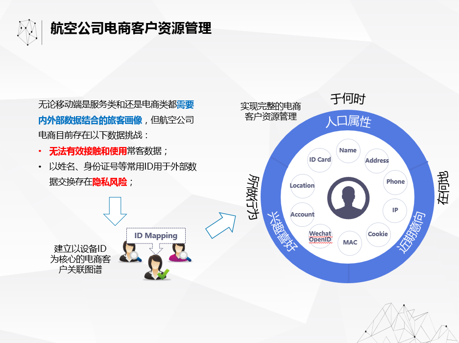 我們回來再說航空行業(yè),其實我有一點(diǎn)一直不理解,今天大家都在講移動互聯(lián)網(wǎng)轉(zhuǎn)型,為什么航空行業(yè)還用身份證號變成身份的唯一標(biāo)識,為什么不是IMEI號,IMEI號就是你移動設(shè)備的身份證號,現(xiàn)在什么東西可以刻畫一個人全方位的塑像,其實是他的移動行為以及線下行為。我們進(jìn)航空公司一直有兩個困惑,第一是為什么電商團(tuán)隊步建立自己的一套基于電商會員的會員體系,第二為什么很多航空公司不去采集用戶的移動設(shè)備信息,而還是把身份證號和手機(jī)號作為主數(shù)據(jù)存儲?