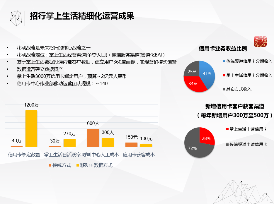 首先看一下運(yùn)營精細(xì)化,這是我們跟招商銀行打造的一款A(yù)PP掌上生活,掌上生活從2012年開始到今天,它的APP信用卡綁卡數(shù)量已經(jīng)從40萬到了將近兩千萬,我給大家展示2015年底招行披露的數(shù)據(jù),它每日的活躍量到了將近三百萬,呼叫中心獲客成本砍掉了一半,信用卡獲客成本砍掉三分之一,而最關(guān)鍵的是招商銀行信用卡分期業(yè)務(wù)有超過30%的利潤來源于掌上生活。它到底是怎么做的,他的APP和微信之間到底是什么關(guān)系?我們都在講航空行業(yè)的移動電商平臺化,一個APP到底影響經(jīng)歷怎樣的路線?招商銀行剛打造它的時候也是一個低頻應(yīng)用,每個人每個月只用它還一次款,甚至很多人都不用,因為有更方便更便捷的微信,它也經(jīng)歷了從工具到做服務(wù)到做電商平臺到做千人千面定制化的過程,這個過程走了三年左右?,F(xiàn)在招商銀行掌上生活的運(yùn)營團(tuán)隊大概160多人,招商銀行兩款A(yù)PP,一款叫做掌上生活,一款叫做手機(jī)銀行,一個服務(wù)類的一個電商類的。今天航空公司的APP到底是電商還是服務(wù)類的?相信很多人并沒有一個定論。