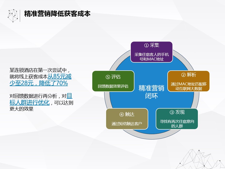 我們看一個集團(tuán)酒店,這是今年剛剛合作的案例,原來酒店集團(tuán)在沒有場景情況下給用戶做一個APP線上短信的促銷活動,大概成本是85元左右,通過用戶的甄別和篩選把原來可能要發(fā)100萬條短信變成10萬條,轉(zhuǎn)化率得到提升,成本降了將近80%,控制在28元。