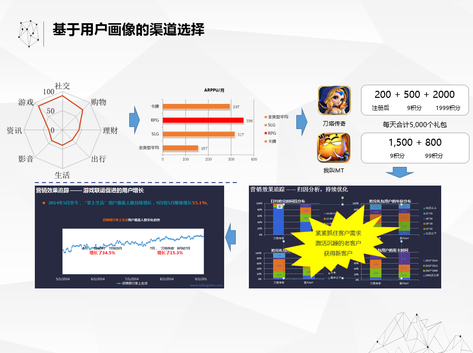 第二個問題數(shù)據(jù)場景化,當(dāng)我去年進(jìn)航空行業(yè)的時候,我一家一家敲航空行業(yè)的門,航空公司的工作人員問我你是干嘛的?我說我是一家大數(shù)據(jù)公司,他們第一反應(yīng)就是騙子,他跟我說你知道嗎?我一天接10家公司的電話,8家是做大數(shù)據(jù)的,四家做用戶畫像的四家做用戶標(biāo)簽的,你說你干什么的?我就問了一個問題,我說你做用戶畫像到底干什么?很多航空公司現(xiàn)在做用戶標(biāo)簽,我也在問你做用戶標(biāo)簽到底要干什么?給大家舉一個招行的例子,這是我們在2013、2014年做的嘗試。招行的積分20塊錢換一個,永久有效。對于企業(yè)來講其實希望每年背著十幾億債務(wù)在走,不知道這個債務(wù)什么時候會爆發(fā),他做了一個用戶洞察,發(fā)現(xiàn)用戶兩個屬性比較強(qiáng),一個社交屬性,一個游戲?qū)傩?。游戲?qū)傩岳锩妫ㄅ祁愑螒蚴钦猩蹄y行的用戶最活躍的東西,就做了一個,用招行的9個積分換《我叫MT》和《刀塔傳奇》198元的大禮包,各取所需,招行需要把積分兌換出去,給會員更多的福利,游戲公司需要招行的背書做資本融資,做用戶的品牌管理。