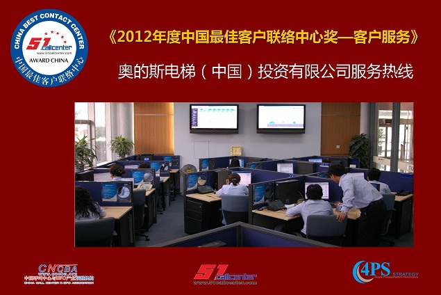 據(jù)悉,奧的斯服務(wù)熱線在近期舉行的”2012年度客戶聯(lián)絡(luò)中心與CRM評選頒獎典禮”中榮獲《2012中國最佳客戶聯(lián)絡(luò)中心客戶服務(wù)獎》,成為電梯業(yè)唯一獲此殊榮的企業(yè)。