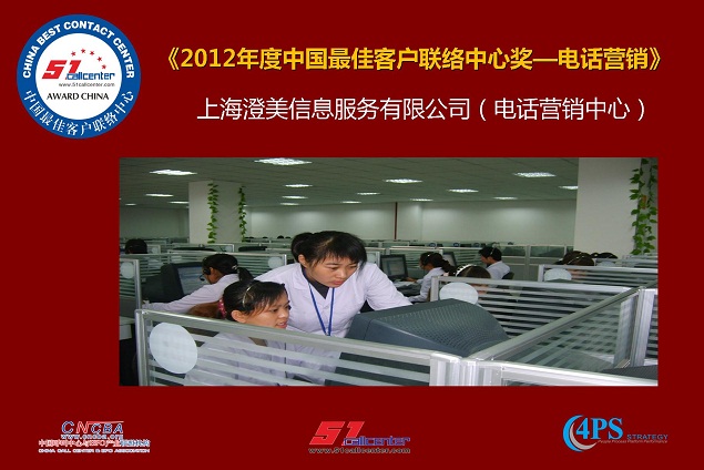 據(jù)悉,上海澄美信息服務有限公司(電話營銷中心)在近期舉行的”2012年度客戶聯(lián)絡中心與CRM評選頒獎典禮”中榮獲《2012最佳電話營銷中心獎》。該活動由呼叫中心與BPO行業(yè)資訊網(wǎng)(51Callcenter)主辦,工信部軟件與集成電路促進中心、中國呼叫中心與BPO產(chǎn)業(yè)聯(lián)盟(CNCBA)指導,4PS聯(lián)絡中心國際標準作為評選指導標準,中國中央電視臺對此做了新聞報道。