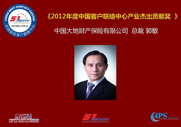 據(jù)悉,中國大地財(cái)產(chǎn)保險(xiǎn)有限公司總裁郭敏在近期舉行的”2012年度客戶聯(lián)絡(luò)中心與CRM評(píng)選頒獎(jiǎng)典禮”中當(dāng)選《2012中國客戶聯(lián)絡(luò)中心產(chǎn)業(yè)杰出貢獻(xiàn)獎(jiǎng)》。