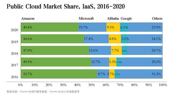據(jù)Gartner近五年發(fā)布的全球云計算數(shù)據(jù)顯示,從2016年至2020年,微軟和阿里云市場份額持續(xù)上升,其中阿里云份額從2016年的3.7%上升至2020年的9.5%,連續(xù)五年上漲;亞馬遜則有所收縮,市場份額從2016年的53.7%降至2020年的40.8%。