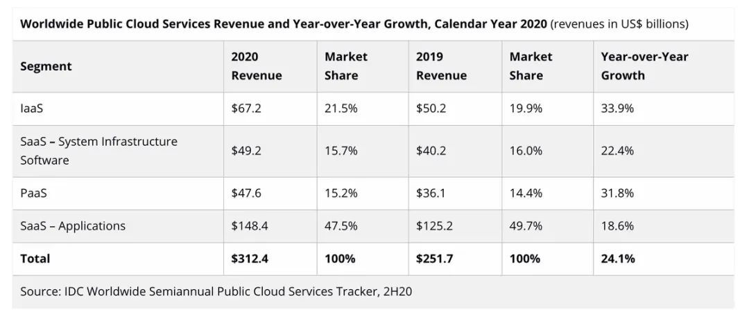 SaaS是云計(jì)算支出的最大占比部分,僅僅是因?yàn)橥ㄟ^(guò)SaaS提供的應(yīng)用程序種類繁多,從Salesforce這樣的CRM到微軟的Office 365。雖然整個(gè)市場(chǎng)正在高速增長(zhǎng),但I(xiàn)aaS和PaaS部分的增長(zhǎng)速度始終快得多,據(jù)分析機(jī)構(gòu)IDC稱:這凸顯了企業(yè)越來(lái)越依賴建立在云基礎(chǔ)設(shè)施、軟件定義的數(shù)據(jù)、計(jì)算和治理解決方案即服務(wù),以及企業(yè)IT內(nèi)部應(yīng)用部署的云原生平臺(tái)上的云基礎(chǔ)。IDC預(yù)測(cè),IaaS和PaaS將繼續(xù)以高于整體云市場(chǎng)的速度增長(zhǎng),因?yàn)閺椥浴㈧`活性和敏捷性指導(dǎo)著IT平臺(tái)的決策。