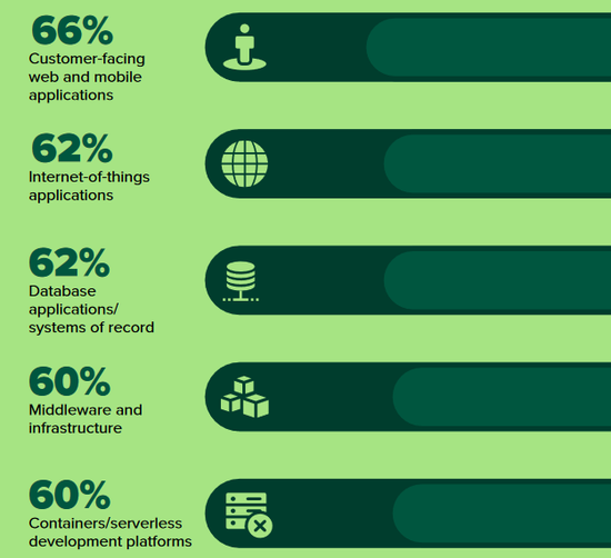 調(diào)查顯示,云平臺(tái)對(duì)企業(yè)數(shù)字化業(yè)務(wù)的開展和應(yīng)用重要性持續(xù)提升,幾乎所有受訪企業(yè)都在云平臺(tái)上運(yùn)行了不同的應(yīng)用程序或工作負(fù)載,包含了面向外部客戶的web、應(yīng)用程序到面向內(nèi)部的軟件開發(fā)平臺(tái)和工具:66%為面向客戶的Web和移動(dòng)應(yīng)用程序;62%為物聯(lián)網(wǎng)應(yīng)用;62%為數(shù)據(jù)庫應(yīng)用程序/記錄系統(tǒng);60%為中間件和基礎(chǔ)設(shè)施;60%為容器/無服務(wù)器開發(fā)平臺(tái)。
