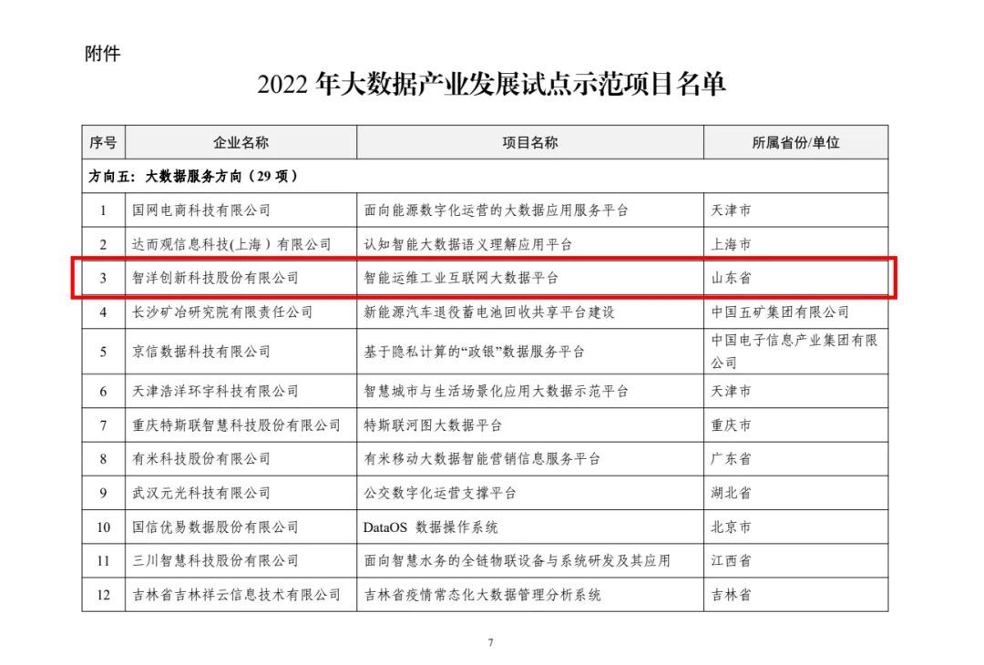 近日,工業(yè)和信息化部發(fā)布了2022年大數據產業(yè)發(fā)展試點示范項目名單,在大數據重點產品和服務試點示范領域的大數據服務方向,智洋創(chuàng)新“智能運維工業(yè)互聯網大數據平臺”作為山東省唯一一家成功入選。