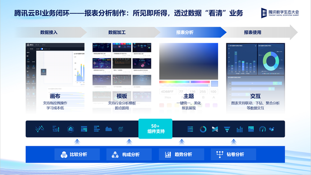 騰訊云BI在底層連接性能強大的云原生大數(shù)據(jù)引擎,中層可集成各類組件、協(xié)同軟件與終端,頂層開放了垂直服務(wù)的生態(tài)共建。在數(shù)據(jù)源接入環(huán)節(jié),支持云原生數(shù)據(jù)、在線協(xié)作類數(shù)據(jù)、業(yè)務(wù)自有數(shù)據(jù)三大類數(shù)據(jù)源;在輕量加工環(huán)節(jié),提供包括多表關(guān)聯(lián)、計算字段等在內(nèi)的輕數(shù)據(jù)加工能力,同時也能無縫對接騰訊云Wedata;在報表分析和使用環(huán)節(jié),提供了50+可視化組件,“拿來即用”,通過簡單的拖拉拽等操作即可快速制作匹配業(yè)務(wù)的報表。同時,借助騰訊企業(yè)微信等能力,騰訊云BI可以支持報表的嵌出及推送, “千人千面”的看到不同權(quán)限的數(shù)據(jù),進行報表查閱、批注、修改等,實現(xiàn)更安全、高效、便捷的業(yè)務(wù)協(xié)同。