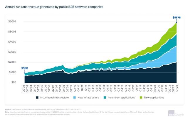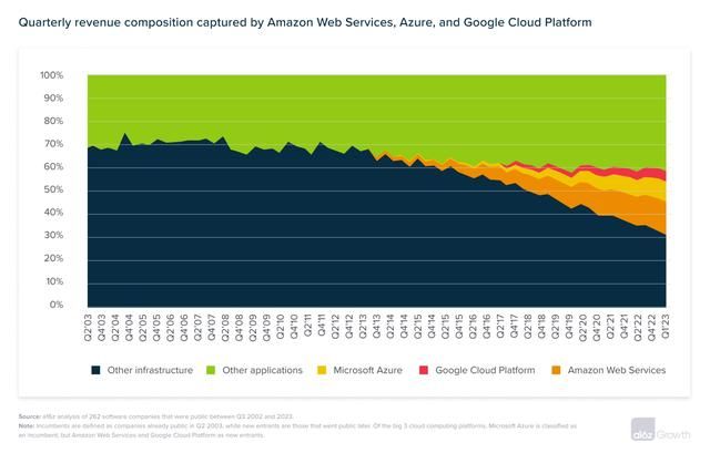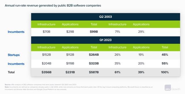 雖然我們無法從一次平臺(tái)轉(zhuǎn)變總結(jié)出軟件物理的自然法則,但在 SaaS 時(shí)代,初創(chuàng)公司在應(yīng)用層面贏得的市場(chǎng)份額要高于基礎(chǔ)設(shè)施層。2003年剛開始那會(huì)兒,云基礎(chǔ)設(shè)施與 SaaS 應(yīng)用的占比大概是 70/30,截止 2023 年第一季度時(shí),這個(gè)比例已經(jīng)變成了 60/40。在此期間,我們樣本里面的新進(jìn)入者在 2310 億美元應(yīng)用市場(chǎng)大概占據(jù)了半壁江山 (1120億美元),但在 3560 億美元的基礎(chǔ)設(shè)施市場(chǎng)所占份額則只有 40%。