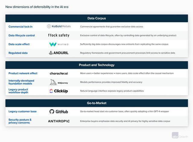 我們預(yù)期,在人工智能時(shí)代,所有這些可防御性來源同樣還是會(huì)很重要。但人工智能產(chǎn)品背后的底層技術(shù)也帶來了新的潛在競(jìng)爭(zhēng)優(yōu)勢(shì)。我們的早期階段合作伙伴已經(jīng)撰寫過關(guān)于生成式人工智能平臺(tái)的價(jià)值捕獲的文章,并繼續(xù)探索了防御性將如何在人工智能基礎(chǔ)設(shè)施當(dāng)中發(fā)揮作用。在本文中,我們將分享評(píng)估成長(zhǎng)階段人工智能公司可防御性的早期框架,這時(shí)候,競(jìng)爭(zhēng)優(yōu)勢(shì)將從早期理論轉(zhuǎn)變?yōu)闆Q定長(zhǎng)期市場(chǎng)贏家和輸家的因素。
