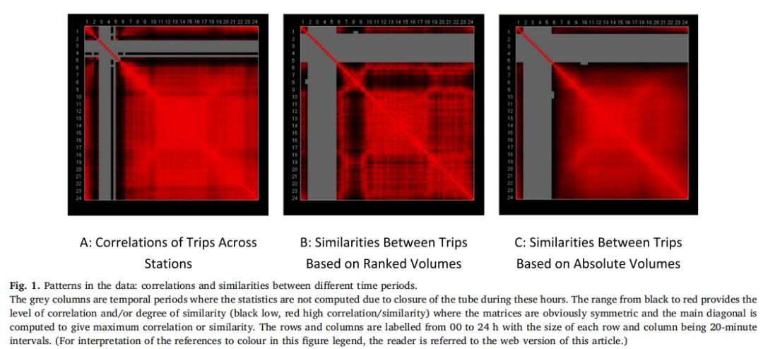圖1顯示了任何一對(duì)時(shí)間段的概況。圖1(A)顯示了任何一對(duì)時(shí)間段與所有站點(diǎn)的行程量之間的相關(guān)密度。在這里,我們根據(jù)交通量的等級(jí)重新排列了這些剖面,然后將其作為每個(gè)時(shí)間段車站的每對(duì)排序剖面之間的歸一化差異進(jìn)行比較,如圖1(B)。在圖1(C)中,我們計(jì)算了相似性的集。從圖1(A)中看出,第一組(早高峰:7:00-9:00)存在高相關(guān)性,即所有站點(diǎn)的運(yùn)量與每個(gè)站點(diǎn)的相關(guān)性都相當(dāng)高。第二組(10:00-15:30) 存在類似時(shí)段,但總行程和總數(shù)量大幅度減少,矩陣仍然在時(shí)間模式上而不是在總體體量上顯示出相似性。第三組(晚高峰: 16:00-19:00)也出現(xiàn)了相似但更清晰的模式。