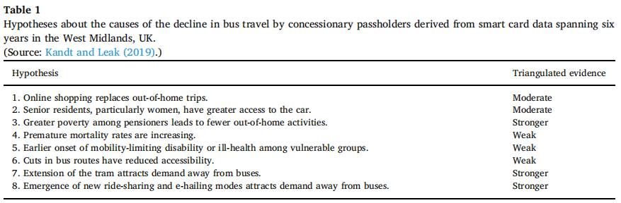 本研究的研究核心是因果關(guān)系。過(guò)去,在超過(guò)幾個(gè)月的時(shí)間框架內(nèi)處理智能卡數(shù)據(jù)的研究很少見(jiàn),許多開(kāi)拓性研究的重點(diǎn)在于刻畫(huà)不同層次的趨勢(shì),而不是系統(tǒng)性的解釋。為了探究長(zhǎng)期框架下的因果關(guān)系,Kandt和Leak(2019)研究了伯明翰地區(qū)2011-2016年66歲及以上乘客進(jìn)行的3億筆智能卡交易數(shù)據(jù)并發(fā)現(xiàn), 六年以來(lái)乘客人數(shù)明顯下降。為了從因果關(guān)系的角度解釋該結(jié)果,我們利用低頻背景數(shù)據(jù)、UK人口普查社區(qū)統(tǒng)計(jì)數(shù)據(jù)和年中人口估計(jì)數(shù)據(jù)發(fā)現(xiàn),在對(duì)免費(fèi)公交車依賴程度通常更高的較貧窮社區(qū),乘車人數(shù)下降尤為明顯。由此,我們能夠得到與政策相關(guān)的因果假設(shè)(表1),最后通過(guò)三角互證衡量假設(shè)的合理性。