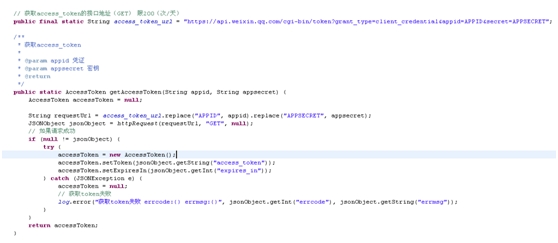 二,獲取access_token。access_token是公眾號的全局唯一票據(jù)。絕大部分接口都需使用access_token。獲取access_token的后臺代碼(java)。