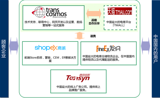 在與中國最大的電商平臺“Tmall”締結(jié)了戰(zhàn)略性合作伙伴關(guān)系之后,transcosmos也相繼與中國的大型電商倉儲物流企業(yè)FineEX以及大型線上廣告公司Tensyn等企業(yè)進(jìn)行了資本與業(yè)務(wù)的合作。在此基礎(chǔ)之上,通過與商派(Shopex)的合作,transcosmos將更加強化電子商務(wù)一站式服務(wù),不僅僅為中國的顧客企業(yè),更為日本以及其他國家的企業(yè)拓展中國電商市場提供更加全面的服務(wù)。