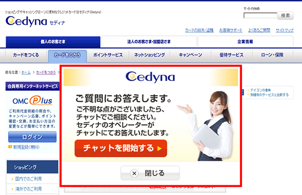 “Cedyna在線支持”是針對(duì)符合一定條件的正在訪問該網(wǎng)站的用戶彈出“問題咨詢”對(duì)話框,當(dāng)用戶選擇“開始在線咨詢”時(shí),就會(huì)連線客服人員實(shí)現(xiàn)實(shí)時(shí)在線的客戶支持服務(wù)。transcosmos為“Cedyna在線支持”提供包括在線客服在內(nèi)的運(yùn)營服務(wù),電通國際信息服務(wù)有限公司(ISID)提供基于云的客服系統(tǒng)解決方案“LiveEngage”。