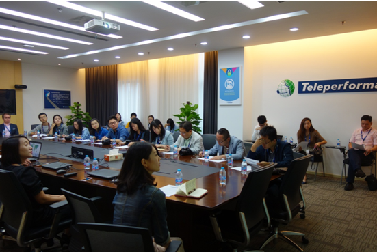 記者代表團一行在會議室聆聽Teleperformance公司業(yè)務及發(fā)展歷史介紹