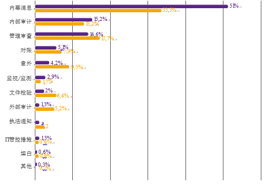根據(jù)注冊(cè)舞弊審查師協(xié)會(huì)在其《2014年全球舞弊研究》中的 舞弊案例分析,有51%的內(nèi)幕消息提供是通過熱線電話向機(jī)構(gòu)提供,而僅有33%非通過熱線提供(見圖4)。這表明熱線 電話對(duì)偵查員工舞弊行為具有重大影響。