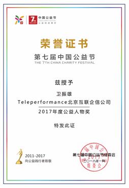 近期,全球多渠道客戶體驗(yàn)管理的領(lǐng)導(dǎo)者Teleperformance北京互聯(lián)企信信息技術(shù)有限公司憑借多年積極開展公益活動(dòng)喜獲第七屆公益節(jié)“2017年度公益集體獎(jiǎng)”, 同時(shí)Teleperformance 中國(guó)區(qū) CEO衛(wèi)振雄先生榮獲“2017年度公益人物”獎(jiǎng)項(xiàng)。