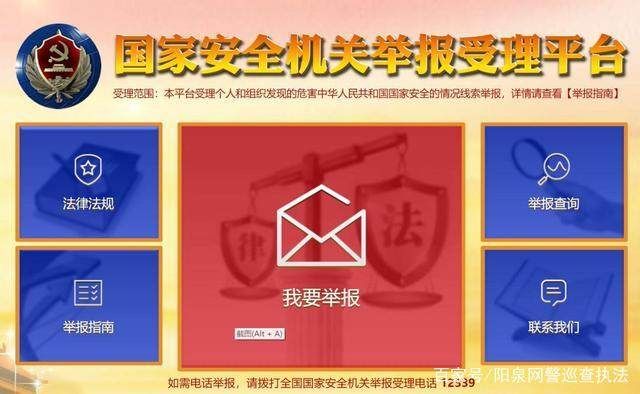 根據(jù)《中華人民共和國憲法》、《中華人民共和國刑法》、《中華人民共和國國家安全法》、《中華人民共和國反間諜法》及其實施細則等法律法規(guī),為加強對危害國家安全犯罪行為、間諜行為和其他危害國家安全行為線索的舉報受理工作,自2018年4月15日起,國家安全部開通互聯(lián)網(wǎng)舉報受理平臺網(wǎng)站www.12339.gov.cn,接受組織和個人的舉報信息。